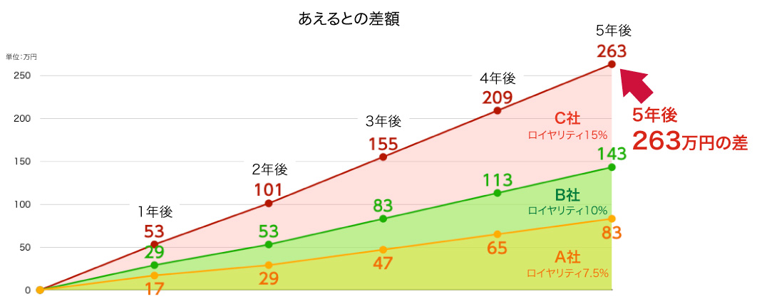 5年後には、ロイヤリティ15%の会社様との比較で、報酬に263万円も差がつきます